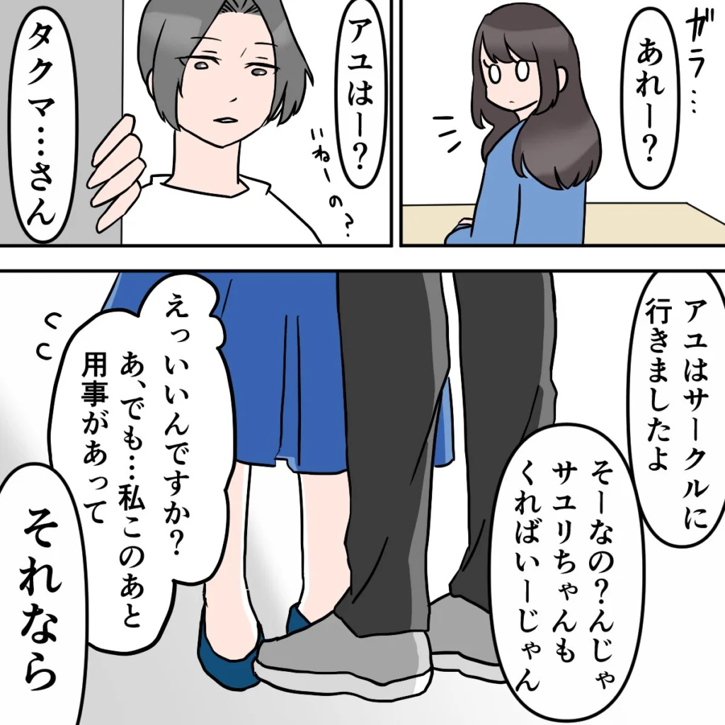 私と別れたあと、しばらく教室に残っていたサユリ。そこへ、タクマさんが私を探しにやって来ました。「アユはサークルに行きましたよ」と伝えると、「そーなの?じゃサユリちゃんもくればいーじゃん」と、タクマさんに誘われたのだとか。しかし、用事があったサユリはタクマさんの誘いを断ったそうです。
