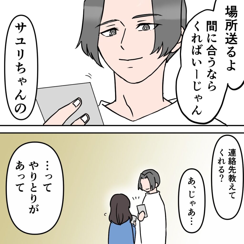 すると、タクマさんはスマホを取り出して「場所送るよ、間に合うならくればいーじゃん!サユリちゃんの連絡先教えてくれる?」とサユリにたずねます。サユリは「アユの知り合いなら」と思い、連絡先を交換したそうです。