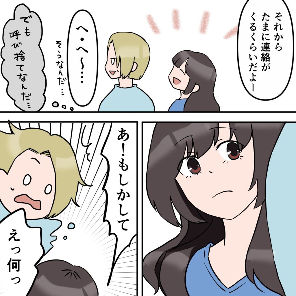 今ではたまに連絡が来るくらいで、それ以上の関係は何もないのだと、サユリは笑いながら話しました。私は「へ、へ~」と相づちを打ちながらも、呼び捨てで呼び合っていることへのモヤモヤをどうしても隠しきれずにいました。するとサユリが、ふと何かに気づいたように「あ!もしかして」と口にしたのです。