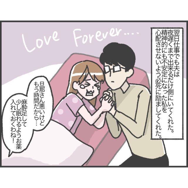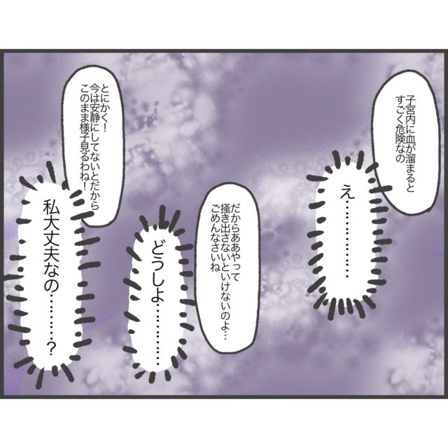 産後に激しい腹痛に襲われたしおさんは「これが後陣痛?」とその痛みに怯えるほどでした。何かドロッとしたものが出たような・・・すると産褥パットを取り換えてくれた看護師さんが急にバタバタとしはじめ、出血が全然治まらず危険な状態なので分娩台で様子をみると告げるのでした。