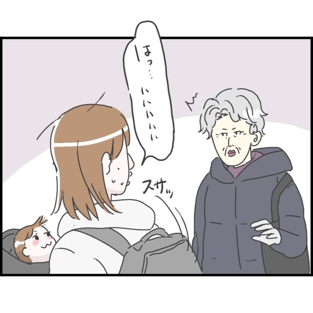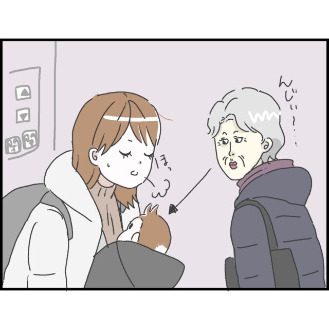 エレベーターに乗ったしおさんと娘ちゃん。娘ちゃんは抱っこ紐で抱っこしていたのですが、エレベーターに乗り合わせたマダムが突然・・・。