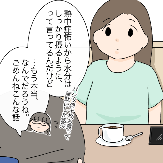 「熱中症が怖いから、水分はしっかり摂るように、って言ってるんだけど・・もう、本当なんでだろうね。ごめんねこんな話」