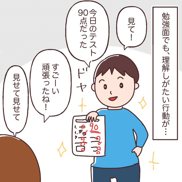 ちなみにトウマには、普段の行動だけでなく、勉強面でも理解しがたい行動があります。珍しくテストで高得点をとったトウマ。嬉しいのか「見て!今日のテスト90点だった」と自慢げに答案用紙を見せてきます。でも、確かに90点はすごい。私は「すごーい!頑張ったね!見せて見せて」と答案用紙を受け取りました。