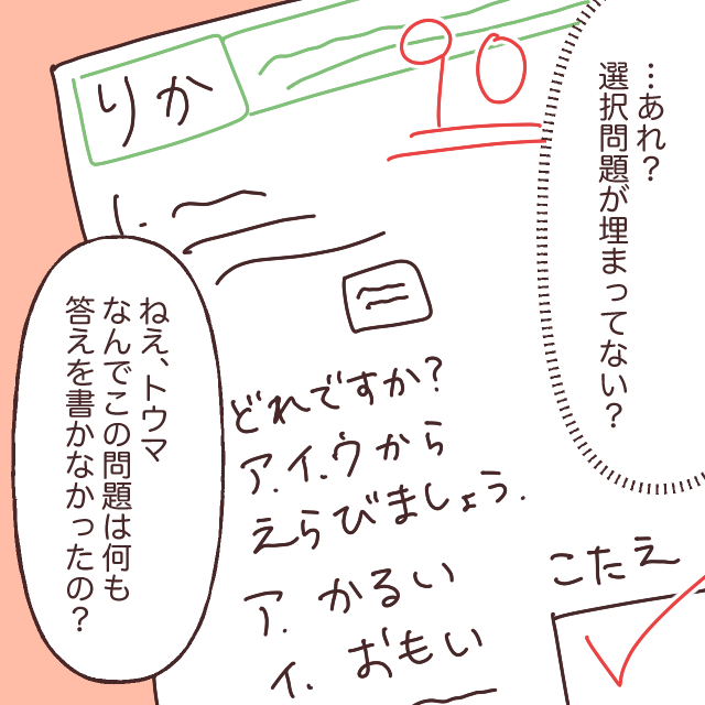 答案用紙に目を通してみると、選択問題がなぜか空欄のままになっていることに気付きました。もしかして見落としたのかなと思い、「ねぇ、なんでこの問題は何も答えを書かなかったの?」と理由をたずねます。