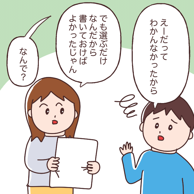 するとトウマは「えー、だってわかんなかったから」と、あっさり答えました。「でも選ぶだけなんだから、書いておけばよかったじゃん」そう伝えると、トウマは心底不思議そうな顔をして「なんで?」と聞き返してきました。