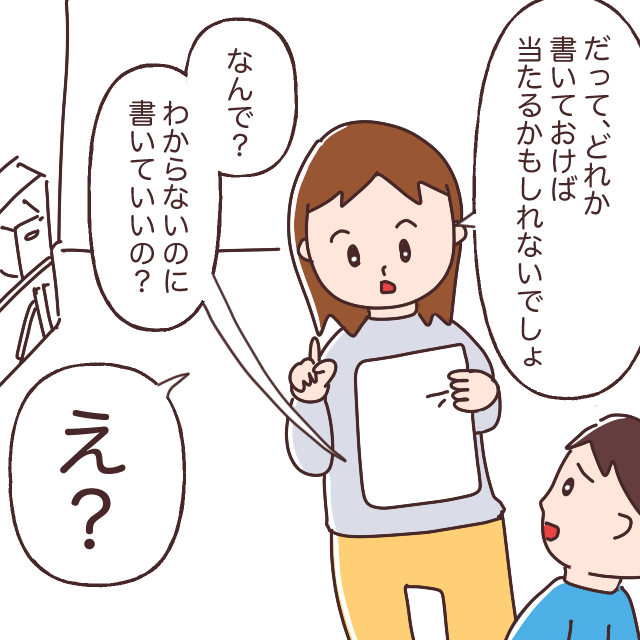 「だって、どれか書いておけば当たるかもしれないでしょ?」そう伝えてみても、トウマはまだピンときていない様子で「なんで?わからないのに書いていいの?」と、まさかのことを聞いてきました。私は思わず「え?」と聞き返してしまいます。