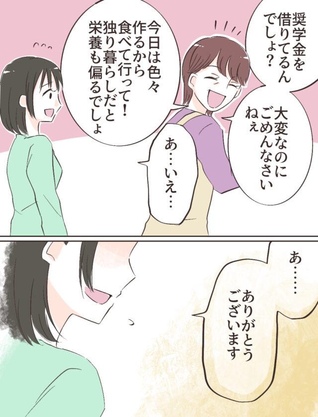すると「奨学金を借りてるんでしょ?大変なのにごめんなさいねぇ」「あ・・いえ・・」タモツさんのお母さんの言葉に戸惑いながら返事をするまひろさん、すると、「今日はいろいろ作るから食べていって!一人暮らしだと栄養も偏るでしょ」心配しての言葉だと思いつつ、「あ・・ありがとうございます」と言いながらも、まひろさんは複雑な気持ちになりました。