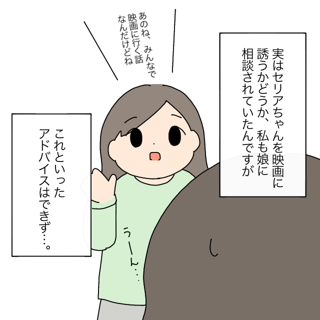 実は、セリアちゃんを映画に誘うべきかどうか私も娘に相談されていたのですが、これといったアドバイスはできず、一番はっきりする方法を提案していました。