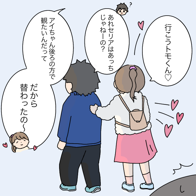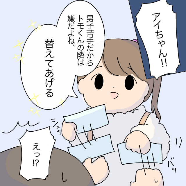 「アイちゃん!!男子苦手だからトモくんの隣は嫌だよね、替えてあげる」