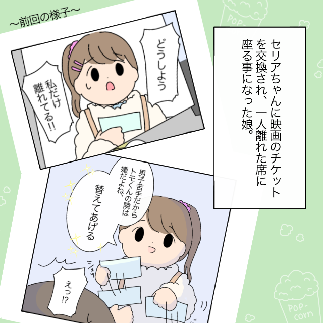 クラスのお友達同士で映画を観に来た娘たち6人。後からチケットを買ったセリアちゃんの席だけがみんなとは離れた後ろの方の席になってしまいました。するとセリアちゃんは、「男子が苦手だから嫌だよね」と勝手な理由をつけて、言い返す間もなく娘のチケットと強引に取り換えてしまいました。なぜなら・・・娘の席はトモキ君の隣だったからです。