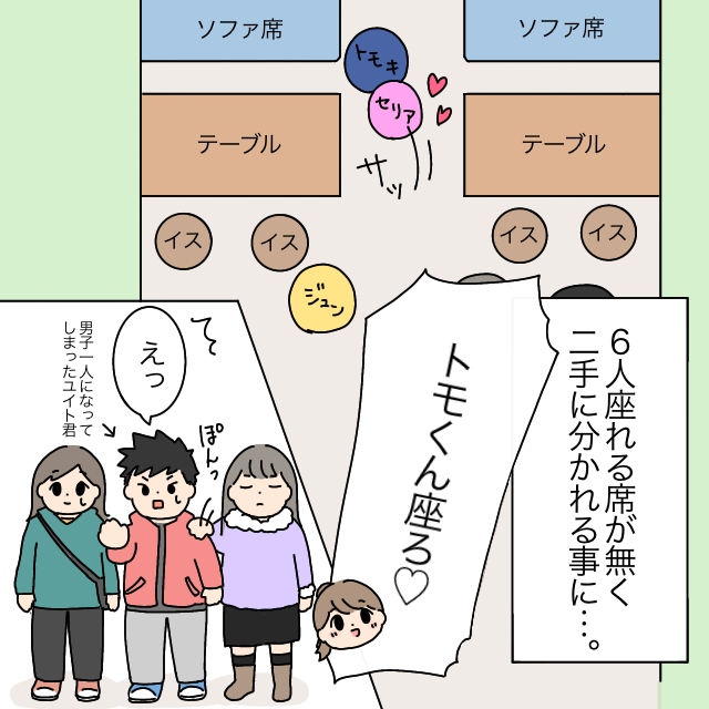 男子同士で座りたかったユイト君は「えっ」と少し残念そうでしたが、時すでに遅し・・・。トモキ君の隣に座ったセリアちゃんが動くはずはありません。