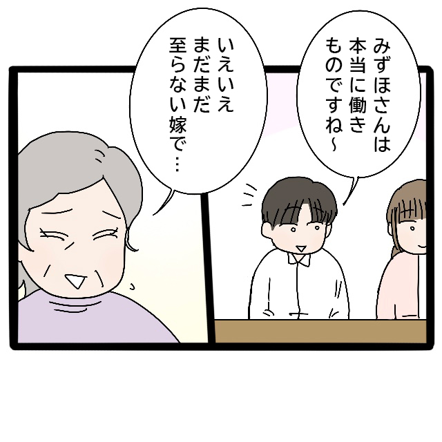 「いえいえ、まだまだ至らない嫁で・・」とお母さんが謙遜しながら答えると、