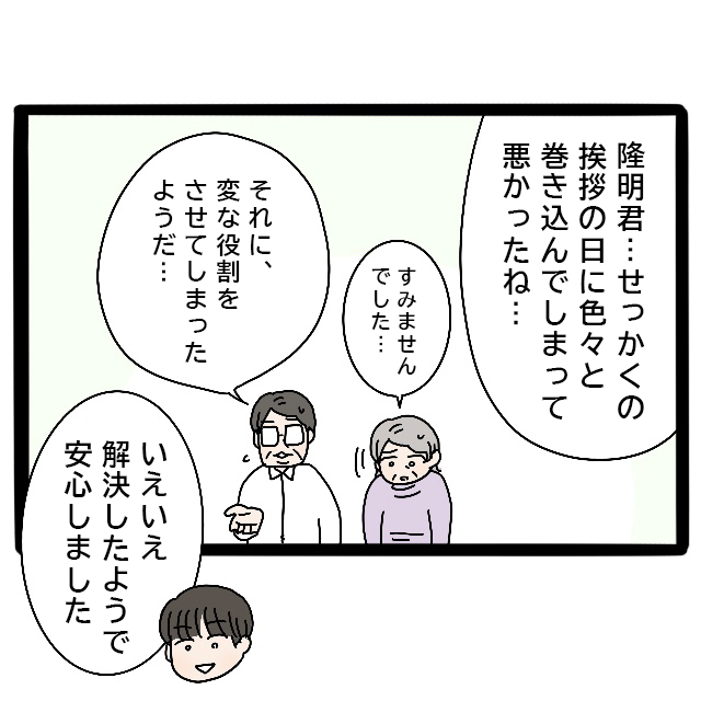 「隆明くん、せっかくの挨拶の日にいろいろ巻き込んでしまって悪かったね・・すみませんでした・・」