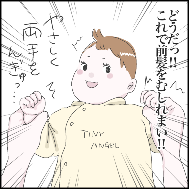 前回、娘ちゃんに顔を近づけたところ前髪をむしられてしまったことから用心するようになったしおさんですが、今回はあることを思いついたようで・・