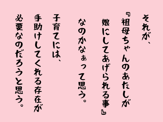 それが、『祖母ちゃんのあたしが娘にしてあげられること』なのかなぁって思うてる子さん、