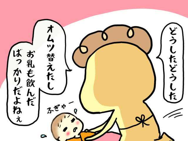 「どうしたどうした。オムツ替えたしお乳も飲んだばっかりだよねぇ」