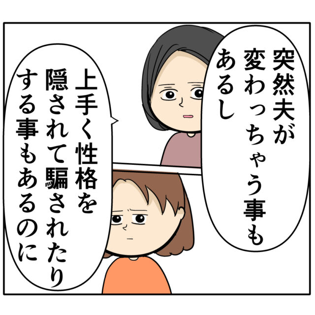 「突然夫が変わっちゃう事もあるし、上手く性格を隠されて騙されたりする事もあるのに」