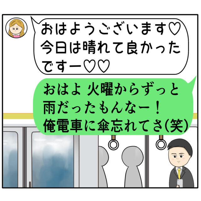 電車に乗ると、さっそくふり子さんからメッセージが届いて浮かれる良し男さん。
