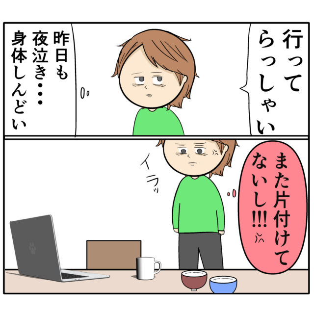 と出しっ放しのパソコンや食べっ放しの食事の後を見ながらイライラ・・