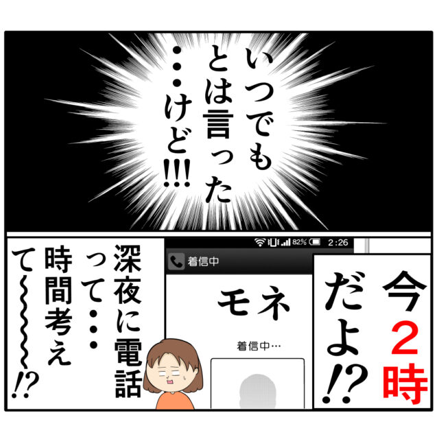 (いつでもとは言った・・・けど!!!今2時だよ!?深夜に電話って・・・時間考えて~!?)