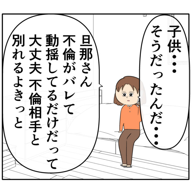 「子供・・・そうだったんだ・・・。旦那さん、不倫がバレて動揺してるだけだって。大丈夫。不倫相手と別れるよ、きっと」
