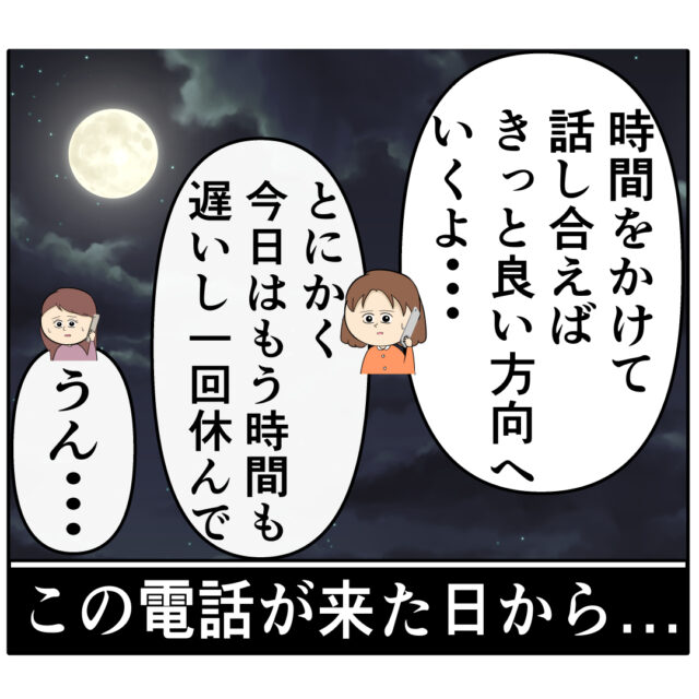 「時間をかけて話し合えばきっと良い方向へいくよ・・・。とにかく今日はもう時間も遅いし一回休んで」