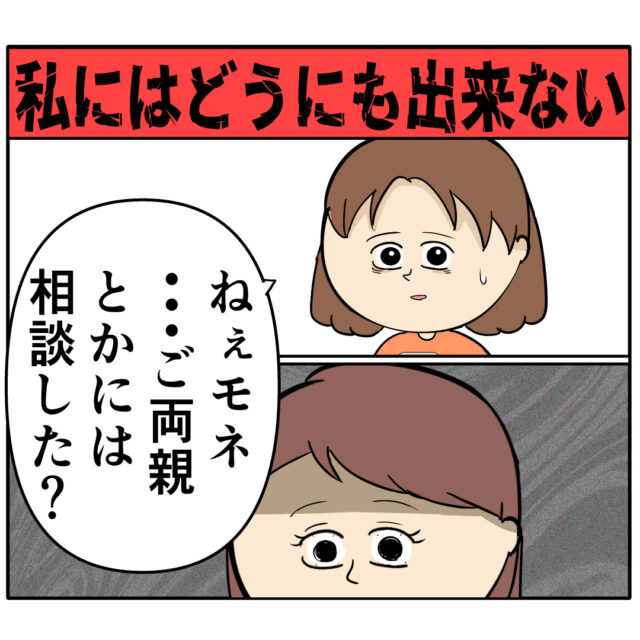 玄関の前で待ち続けるモネさんの気配を感じ、開けたくないと思いつつドアを開けたマリコさん、「明日夫と話すんだけど、『ちゃんと話し合えばきっと良い方向に行く』ってマリコが言ってたから」とモネさんに言われ、「一つだけ確かなことは・・問題が解決するまで、モエは家に来続ける・・」と感じ、最悪の結末を想像して・・