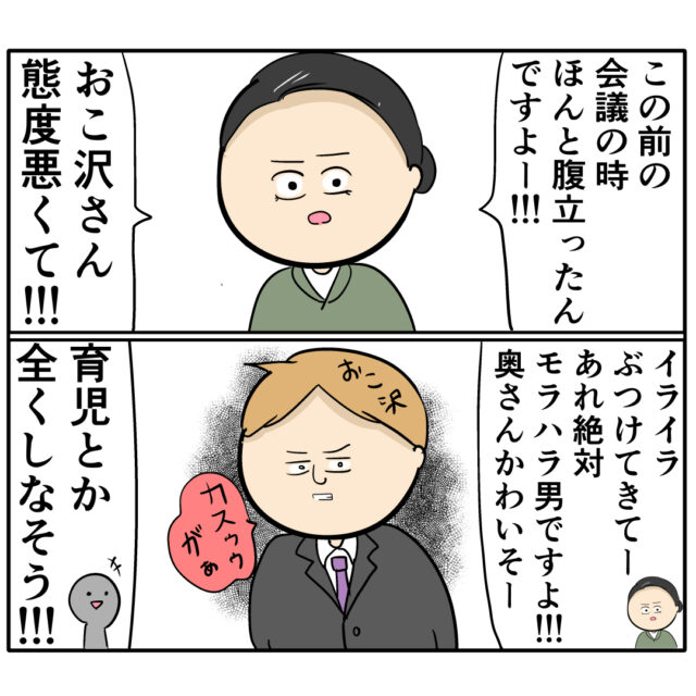 「この前の会議の時、ほんと腹立ったんですよー!!おこ沢さん態度悪くて!!イライラぶつけてきて・・あれ絶対モラハラ男ですよ!奥さんかわいそー!」