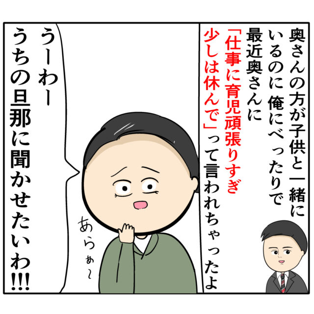 「奥さんの方が子どもと一緒にいるのに、俺にべったりで・・最近奥さんに『仕事に育児頑張りすぎ!少しは休んで』って言われちゃったよ」