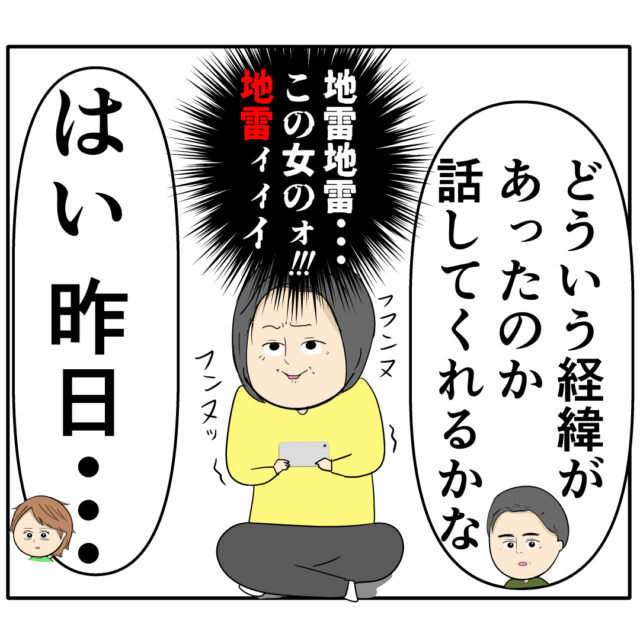 「どういう経緯があったのか話してくれるかな」「はい。昨日・・」義父がすみれさんにたずね、すみれさんが話し出す間も「地雷地雷・・この女のォ!!!地雷ィィィ!」とすみれさんを激怒させたいやば美さんは頭の中で考え続けました。
