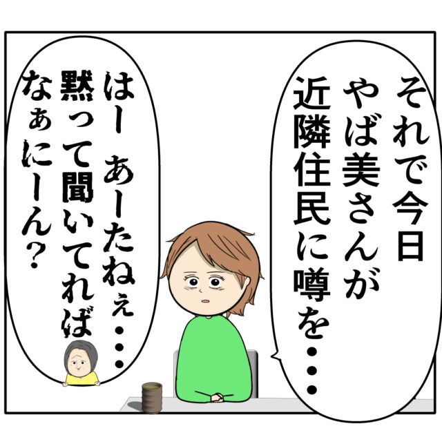 「それで今日、やば美さんが近隣住民に噂を・・」すみれさんの話を遮って「はー・・あーたねぇ・・黙って聞いてればなぁにーん?」とやば美さんが話し出しました。