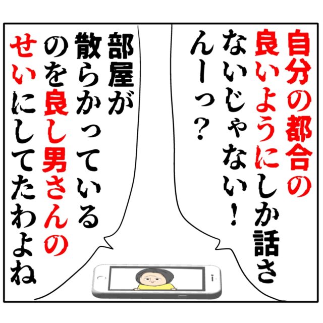 「自分の都合の良いようにしか話さないじゃない!んーっ?部屋が散らかっているのを良し男さんのせいにしてたわよね」やば美さんが言葉を続けます。