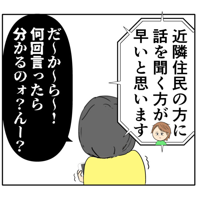 そして「近隣住民の方に話を聞く方が早いと思います」と提案したのですが、「だ~か~ら~!何回言ったら分かるのォ?んー?」とやば美さんが話の腰を折りました。
