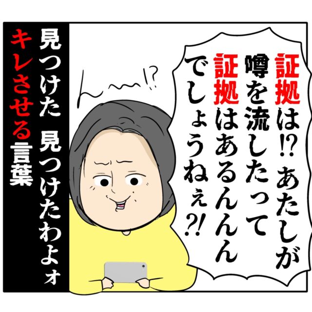 「証拠は!?あたしが噂を流したって証拠はあるんんんでしょうねぇ!?」そう言いながら、「見つけた!見つけたわよォ。キレさせる言葉!」とやば美さんは心の中で呟きました。