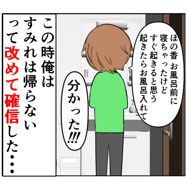 ご飯の前に寝てしまったほの香ちゃんが起きたらお風呂に入れるように良し男さんに指示をするすみれさんの背中はいつも通りでした。良し男さんはあらためて、すみれさんが実家に帰ることは無いと確信したのです。