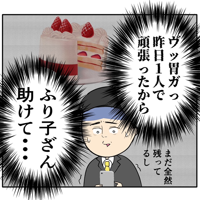 結婚記念日をすみれさんと一緒に祝うために買ったホールケーキを一人でかなり食べたため、朝から胃が苦しい良し男さん。困ったことがあるとやはりふり子さんに連絡します。さっそくメッセージを送りました。