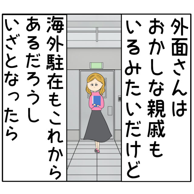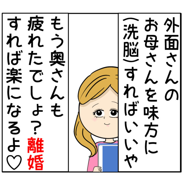 「海外駐在もこれからあるだろうし、いざとなったら外面さんのお母さんを味方に(洗脳)すればいいや」と企むふり子さん。そして、「もう奥さんも疲れたでしょ?離婚すれば楽になるよ(ハート)」と良し男さんとすみれさんが早く離婚すれば良いのにと願っていました。