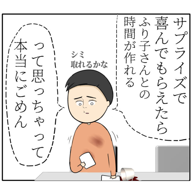 「サプライズで喜んでもらえたら、ふり子さんとの時間が作れるって思っちゃってごめん。」もう全て白状するしかないと観念している良し男さんは、消え入りそうな声で告白しました。