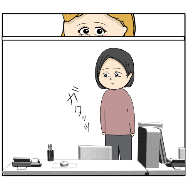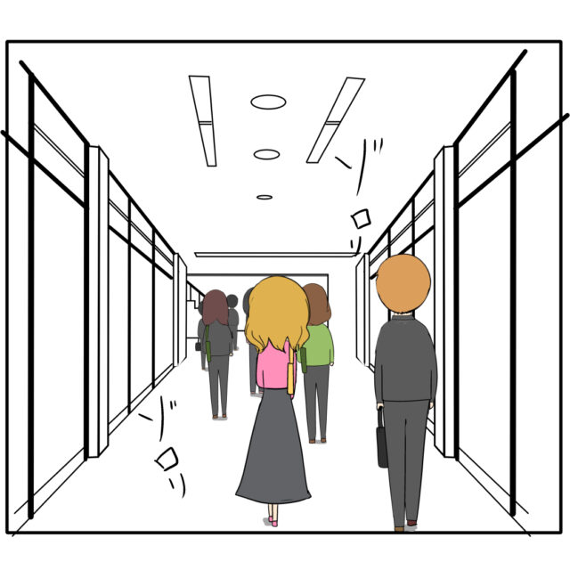 そして社員がぞろぞろと帰宅しようとオフィスから出て来て、ふり子さんも良し男さんの後を追うように部屋を出ました。