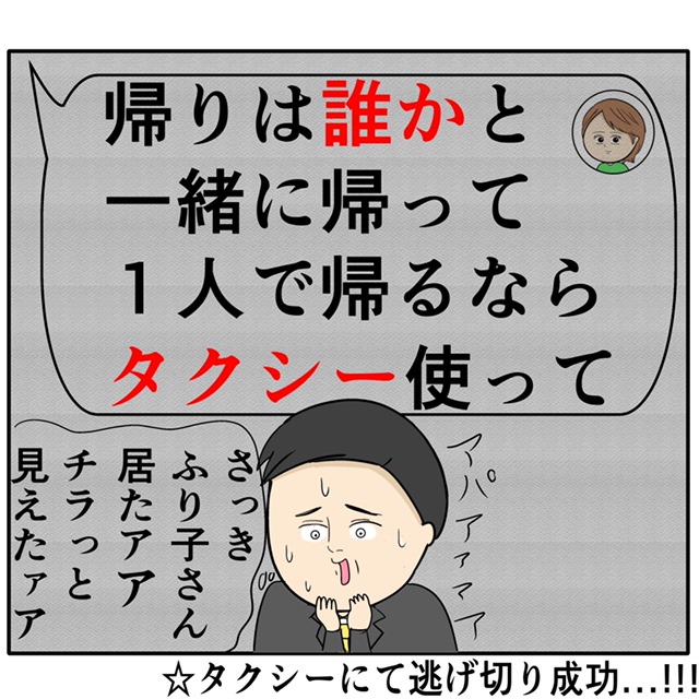 会社の定時の時間になり、社員が帰り支度を始めると、ふり子さんは帰るフリをしながら「もしもマキさんと良し男さんが一緒に帰ろうとするなら、きっと奥さんの指示」と当りをつけていました。そして良し男さんをチラリと見ると相変わらず体調が悪そうな様子。マキさんはというと、いつも通りに帰り支度をしていました。良し男さんが会社を出るまでしっかり見ていたふり子さん、良し男さんの隣には村上さんが登場し「大丈夫っすか!?タクシー呼びます!?」と心配する様子を見て「村上くんと一緒か・・」ふり子さんは心の中で呟きました。「帰りは誰かと一緒に。1人ならタクシー使って」と、すみれさんのアドバイスをしっかり守った良し男さんでした。