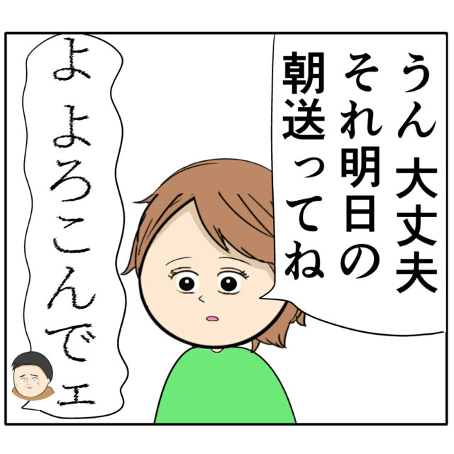 「うん、大丈夫。それ明日の朝送ってね」すみれさんにそう言われて「よ、よろこんでェ」と良し男さんは返事をしました。