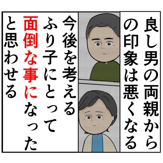 良し男の両親からの印象は悪くなる。さらに今後を考えるふり子にとって面倒な事になったと思わせる。
