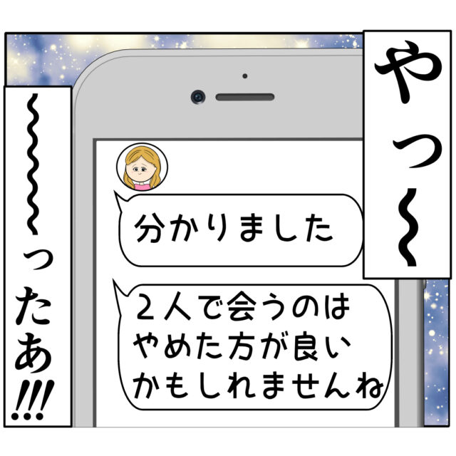 ふり子さんから届いたメッセージは「分かりました。2人で会うのはやめた方が良いかもしれませんね」というもの。作戦通りふり子さんが諦めてくれたと良し男さんは大喜び。