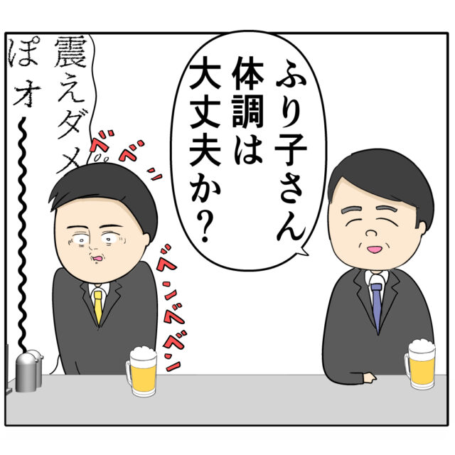 居酒屋では、「ふり子さん、体調は大丈夫か?」とふり子さんににこやかに声をかける部長の隣で、予想外のふり子さんの登場に動揺する良し男さんが体の震えを必死に止めようとしていました。