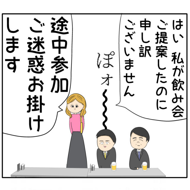 「はい。私が飲み会ご提案したのに申し訳ございません。途中参加ご迷惑おかけします」とふり子さん。この飲み会はふり子さんが企画したものだったのです。