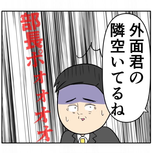 「外面君の隣空いてるね」部長が良し男さんの隣の席をふり子さんに勧め、良し男さんは青ざめます。