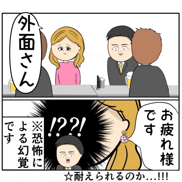 良し男さんの隣に座り「外面さん、お疲れ様です」と声をかけるふり子さん。良し男さんはあまりの恐怖で幻覚が見えてきました。