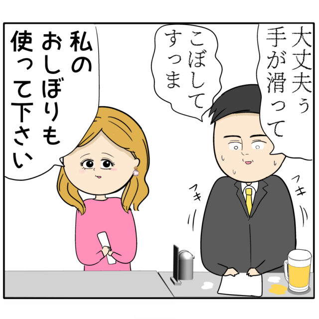 「大丈夫ぅ手が滑って」と動揺を隠しながらテーブルを拭く良し男さんに、「私のおしぼりも使って下さい」とふり子さんが気遣います。