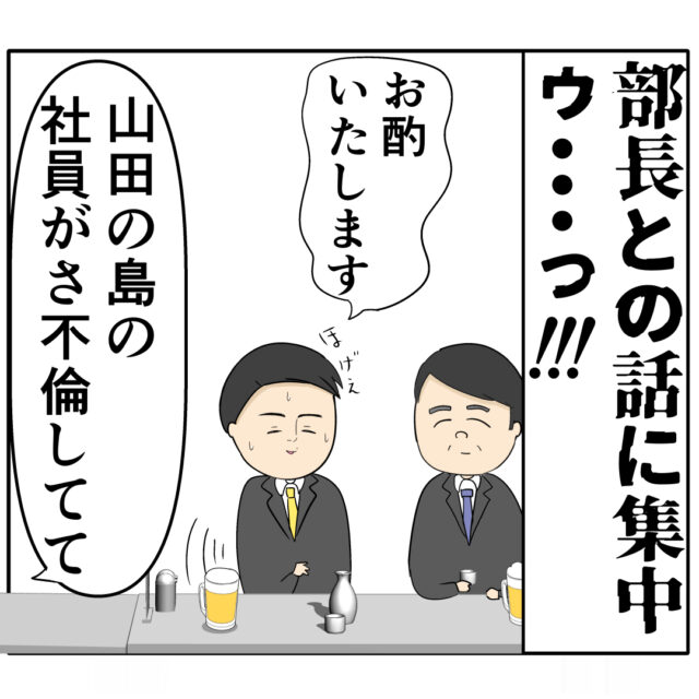 良し男さんは気を取り直して部長との会話に集中しようとしますが、背苦腹さんが「山田の島の社員がさ、不倫してて」と先ほどの話の続きを始めました。