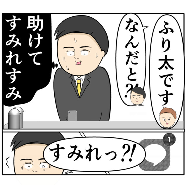 「ふり太です」と背苦腹さんが答えると「なんだと?!」と驚く部長。居心地の悪い話題に「助けてすみれ」と良し男さんが心の中で叫んでいると、ちょうどすみれさんからメッセージが届きました。